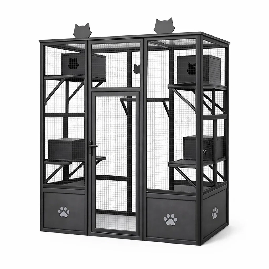 Enclos pour chat en métal noir avec étagères