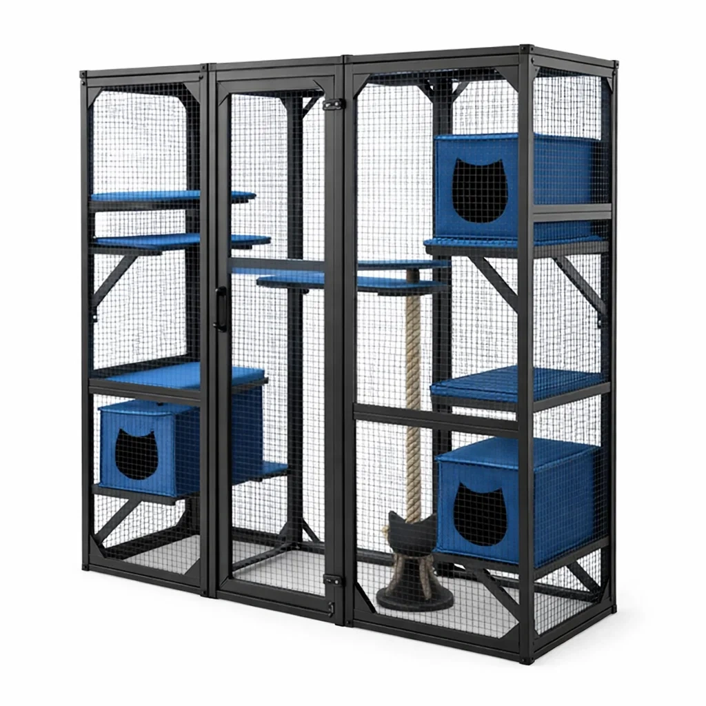Enclos pour chat en métal noir avec accessoires bleus