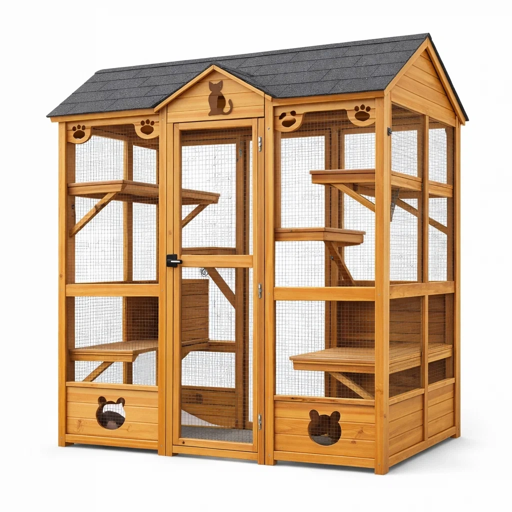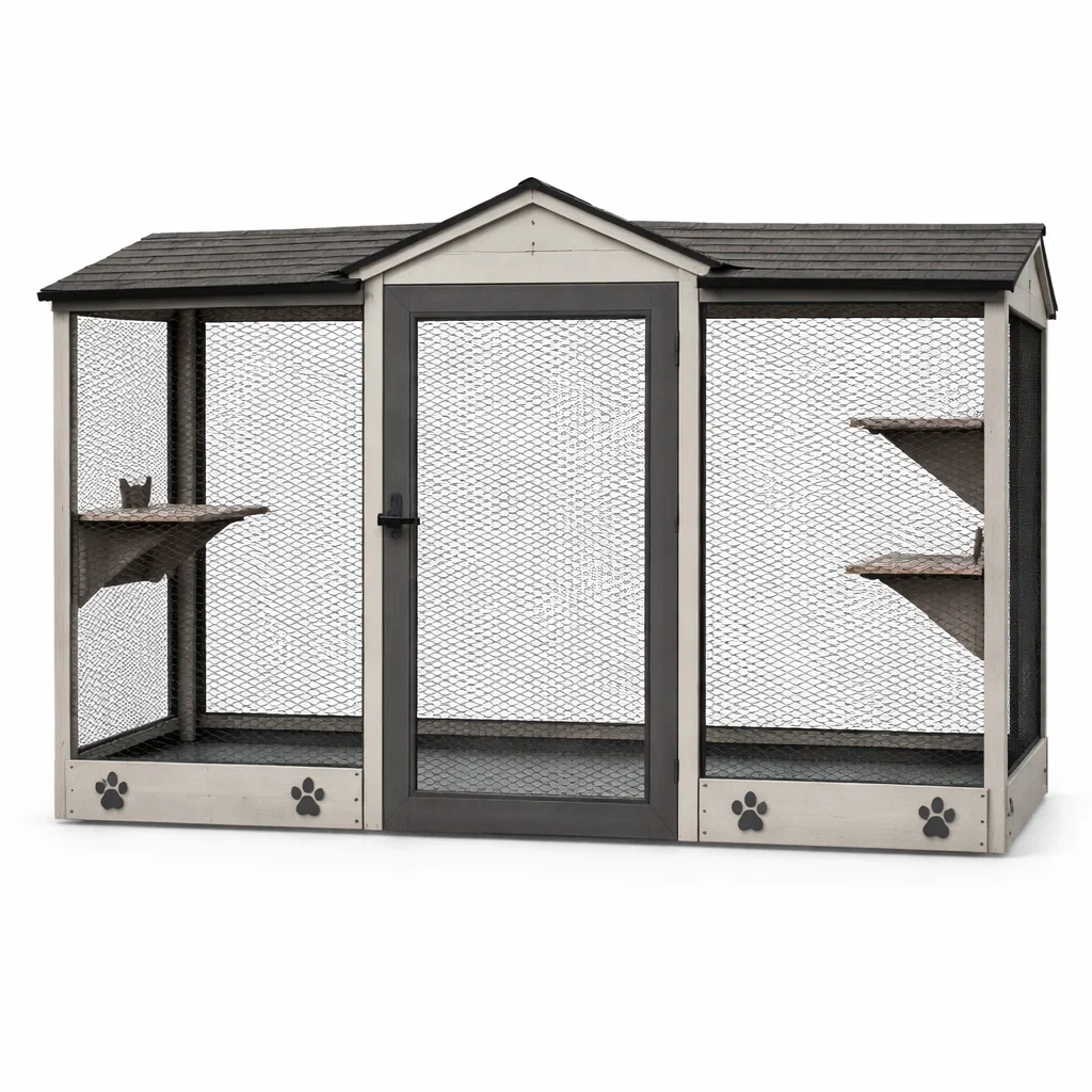 Enclos pour chat extérieur en bois avec toit en bardeaux