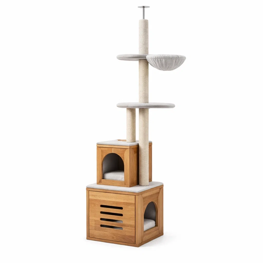 Structure multi-niveaux avec deux niches, trois plateformes et une corbeille