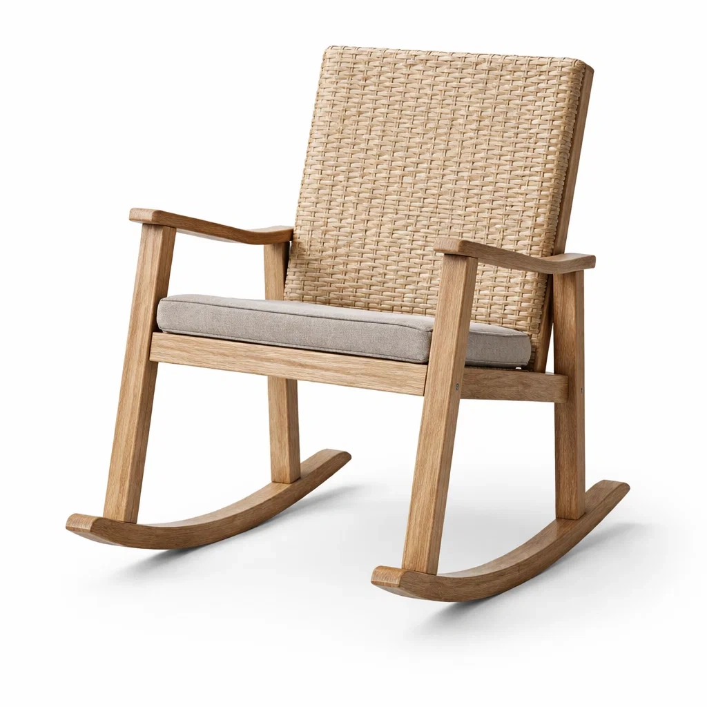 Structure en bois massif avec sangle en résine tressée. Coussin en tissu polyester beige d'une épaisseur de 5 cm.