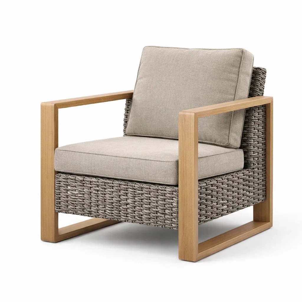 Matériau: Structure en acacia, tressage en polyéthylène, coussins en lin et mousse polyuréthane.