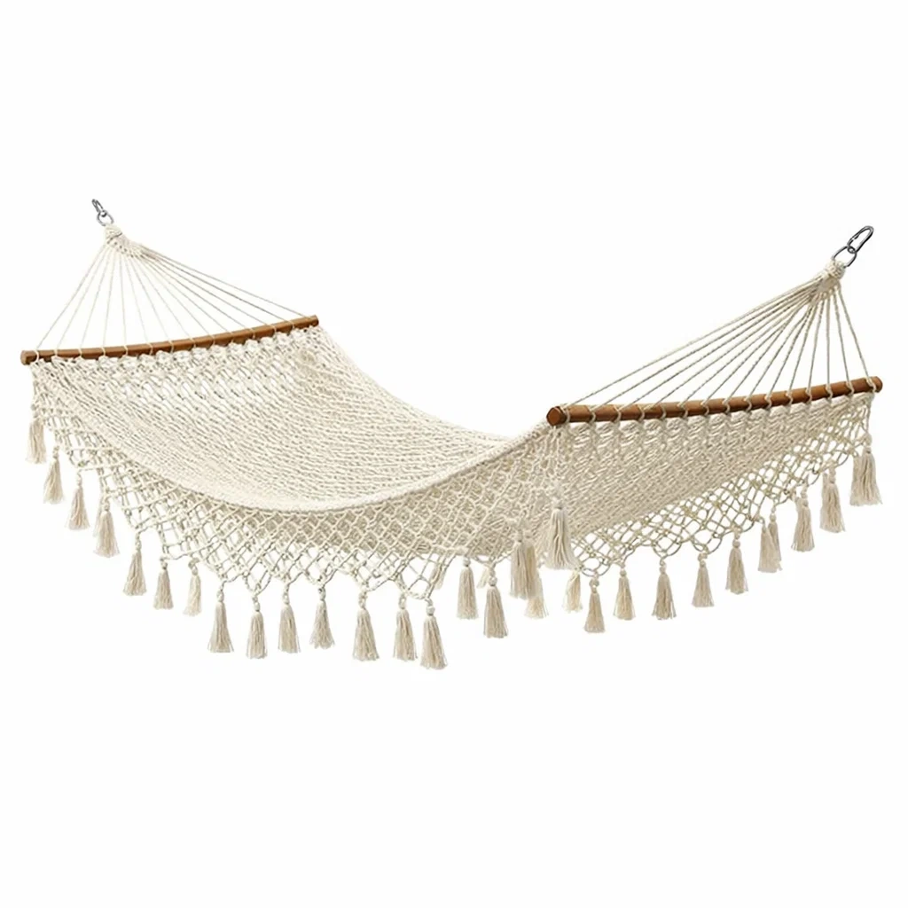 Hamac en coton macramé beige avec barres en bois 200 x 150 cm