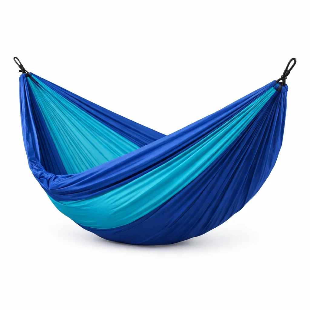 Ce hamac est fabriqué en nylon respirant et présente des couleurs bleu et turquoise. Ses dimensions sont de 275 cm de longueur et 140 cm de largeur, avec une capacité de charge maximale de 200 kg.